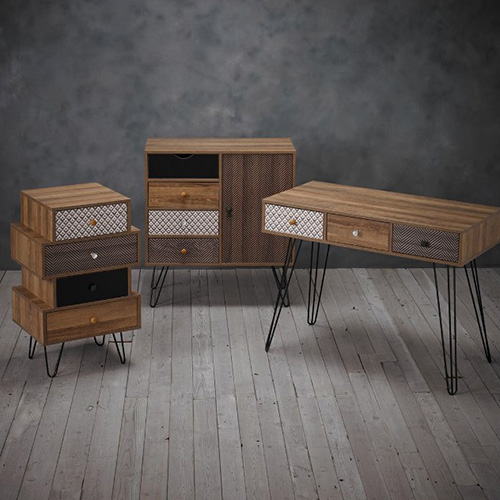 The Espana Desk can be used for business and pleasure. This piece from the Espana range can be utilised as either a desk or console table, putting it to multiple uses. It's distinctive design will add a unique look to your living room or bedroom. The foils printed on the face of the drawers, tall black wired legs and wood effect finish makes this furniture piece suit all interiors while also adding a quirky feel to the room.