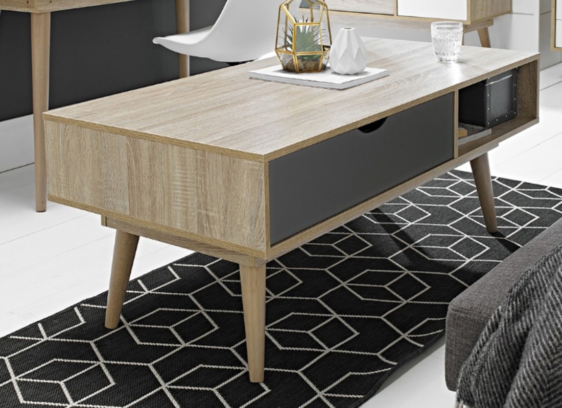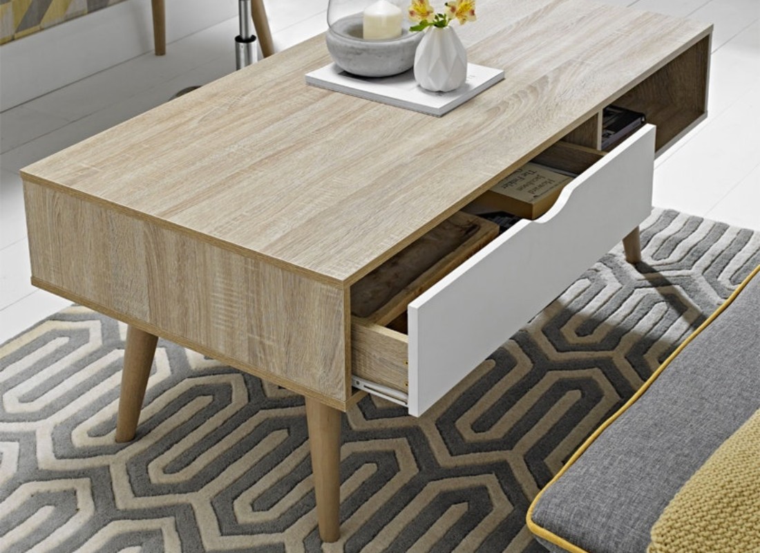 Upgrade your home today with this modern and unique looking coffee table. The angled legs and oak exterior paired with the sleek drawer in the centre makes this a contemporary design. The spacious drawer and shelf unit allows for storing your living room essentials. The Snowdon Coffee Table is available in white or grey colour options.