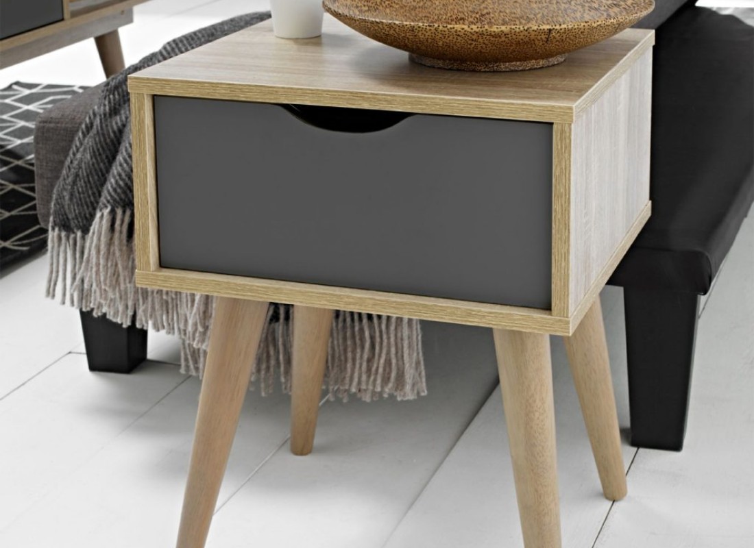 Our Snowdon Lamp Table delivers a retro look to your living space and looks great next to any sofa or chair. The table has a single drawer, available in white or grey colour option, and has that perfect oak finish. The angled legs make it a unique furniture piece and is great for adding extra storage to your home.